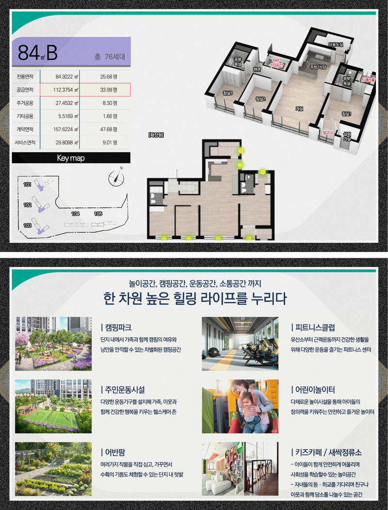 커뮤니티 시설로는 피트니스센터, 실내골프연습장, 주민운동시설, 캠핑파크, 어반팜, 어린이놀이터, 키즈카페 등이 마련되어 있으며, 반려동물을 위한 애견파크도 조성될 예정입니다.