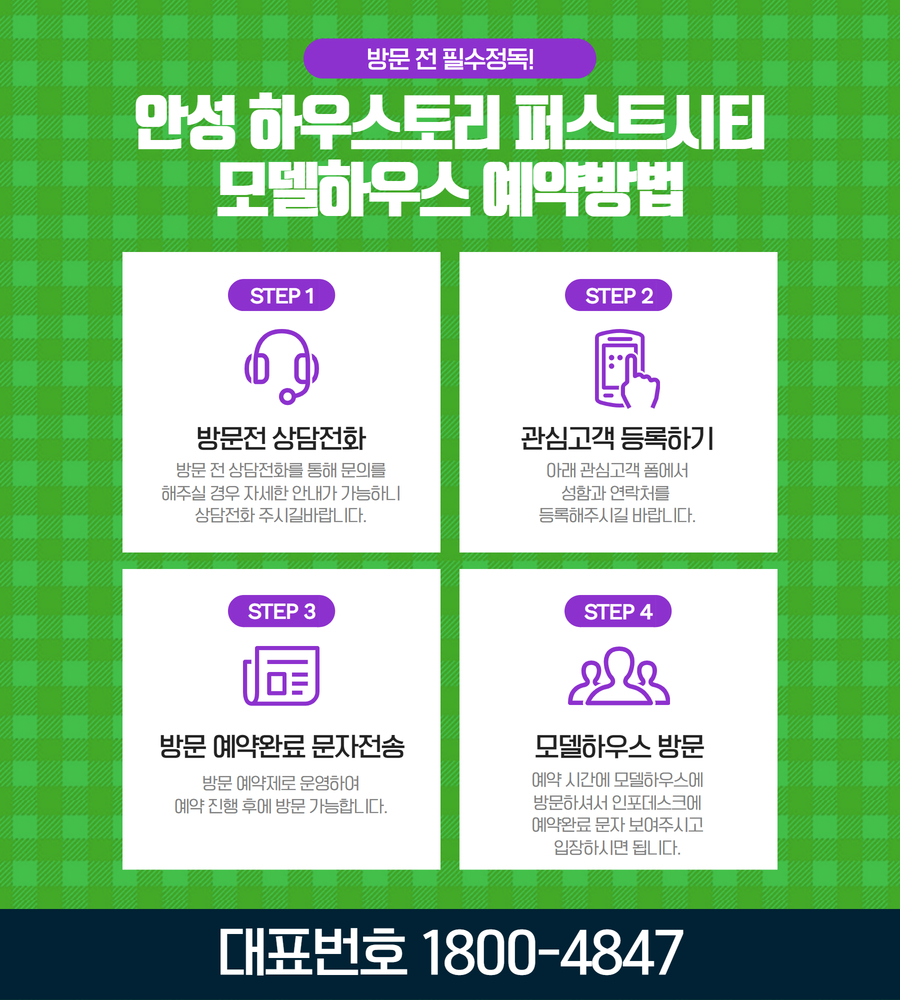 안성 하우스토리 퍼스트시티 모델하우스는 경기 안성시 가사동 일원에서 운영 중이며, 방문 예약제로 진행됩니다. 모델하우스 방문 시 전문 상담을 통해 세부적인 분양가 및 계약 조건을 안내받을 수 있으며, 유니트 실물을 직접 확인할 수 있습니다. 아래 대표번호를 통해 방문 예약 및 분양가 상담 가능합니다.
